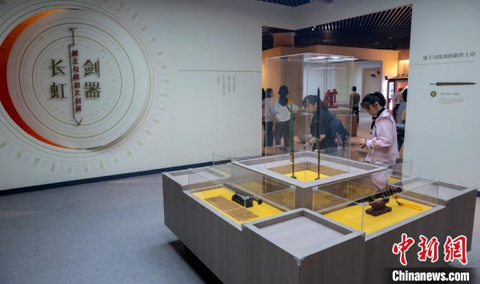 中新社武汉5月17日电 (记者梁婷)今年是越王勾践剑出土60周年,“剑器长虹”越王勾践剑文创展近日在湖北省博物馆展出,吸引众多观众前来参观。