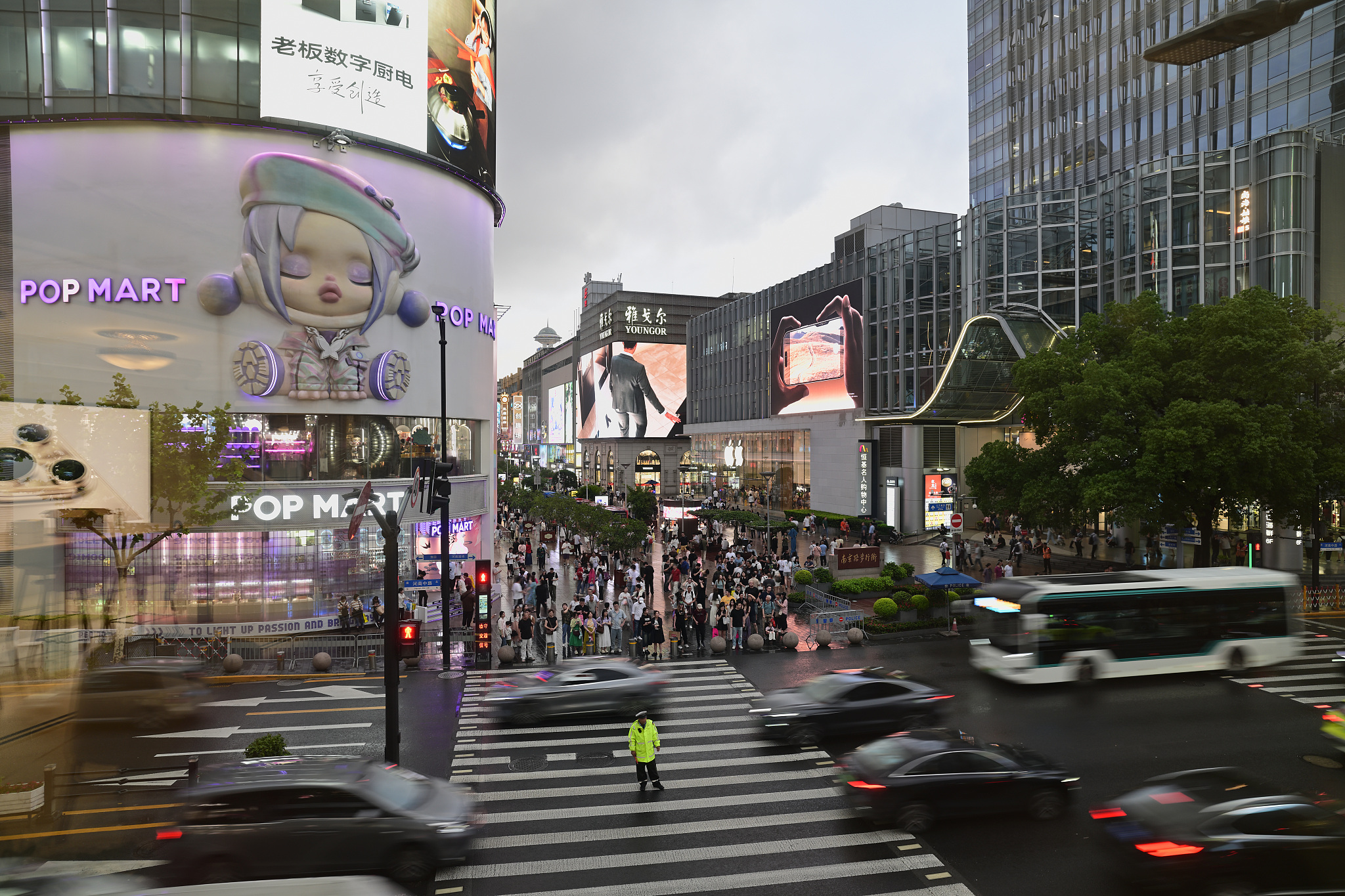 另一个特点是和社交地位的强绑定。泡泡玛特在选址上很讲究,总是选在城市最核心的豪华地段。比如在上海南京东路丁字路口的旗舰店,在泰国也是高端商场。这种策略很有效——当人们经过LV、爱马仕就看到泡泡玛特,自然把两者符号绑定。很多人晒照片时会把玩偶挂在LV或爱马仕包带上作为配饰。